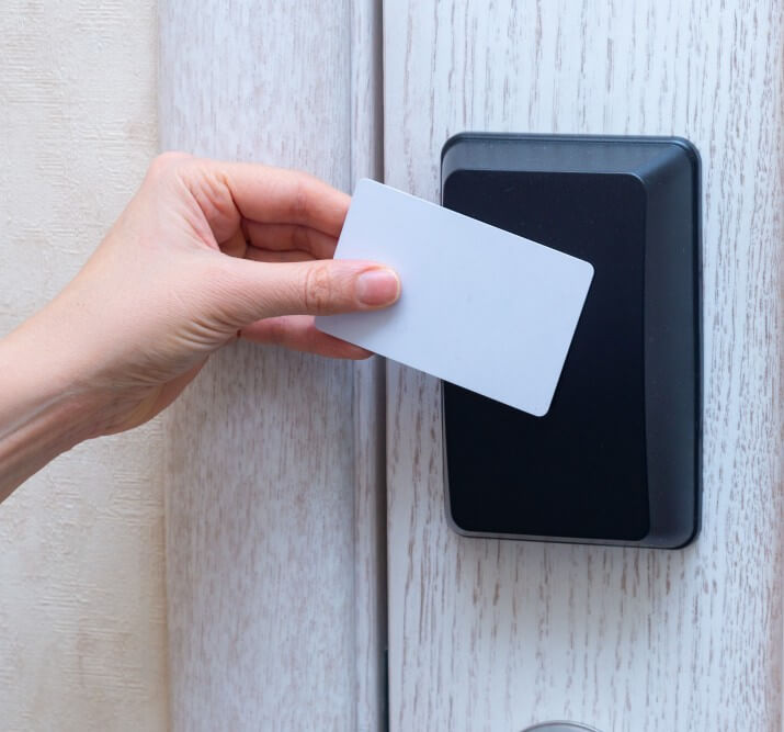- Card Reader SystemsCard reader doors can be paired with existing door hardware. They open when the user uses an authorized card, which communicates with the lock’s internal access control system through RFID.